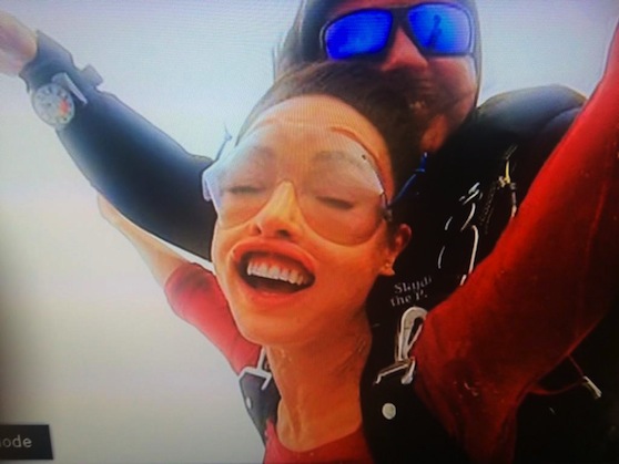 Now, I dunno about you, but “indoor sky diving” is kind of not a thing. As in, being blown about by a large industrial fan is NOT the same as legit jumping from a tiny plane into the actual sky. But ten points for enthusiasm.